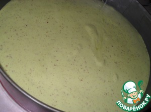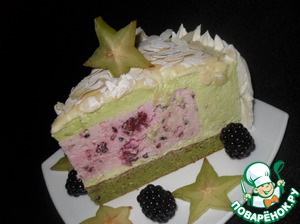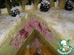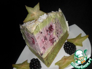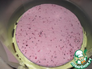 Приступим к сборке: на дно формы диаметром 26 см положить бисквит, затем часть фисташкового мусса, застывший диск ежевичного мусса, остаток фисташкового мусса.