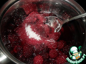 Ежевичный мусс: 12 г листового желатина залить холодной водой. 300 г ежевики (у меня оттаявшая свежезамороженная) закипятить с 2 ст. л. сахара, снять с огня и добавить отжатый желатин. Остудить до комнатной температуры.