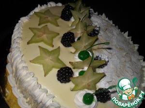 Готовый торт украсить взбитыми сливками, ежевикой, миндальными лепестками, коктейльной вишней.