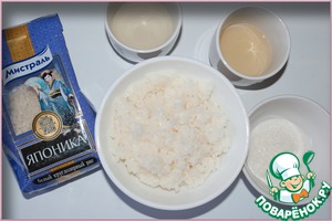 Варим рис, как для суши. Я варю на один стакан риса 1,3 стакана воды. Посолиить, поставить на огонь, закрыть крышкой, довести до кипения. Потом сделать огонь на минимум и варить 20-23 минуты. Не мешать.