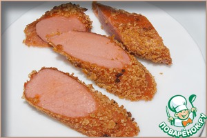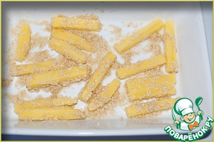 Сосиску обвалять в панировке и обжарить немного в масле. Готовую сосиску разрезать на дольки.