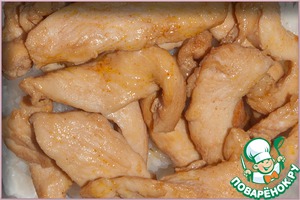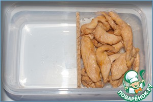 Снять с куриной грудки кожу. Порезать грудку на полоски и обжарить на сковороде без масла в соевом соусе (4 столовых ложки).
