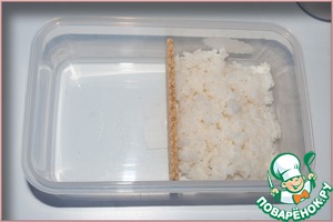 В Японии для бэнто используют специальные ланч-боксы. Вы можете взять обыкновенный контейнер для продуктов (для разогрева в микроволновой печи, например). Разделяем перегородкой контейнер на 2 части (я взяла вафельный хлебец), выкладываем на 1 половинку рис.