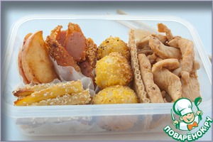 В бэнто продукты должны разделяться листьями салата, перегородками или бумажными вкладышами. Я использовала для этого самодельные стаканчики из пергамента для выпечки.