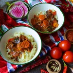 Посмотрела рецепты лагмана, но такого, как я научилась делать в Киргизии, нет. B Киргизии, лагман был повседневным блюдом, а здесь в России готовлю только по праздникам... и то, когда удастся урвать маргеланскую редьку. Вполне подходит как к первому, так и ко второму блюду.