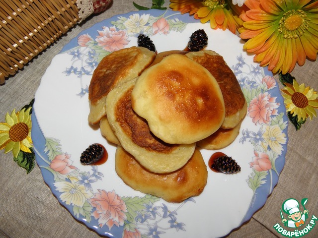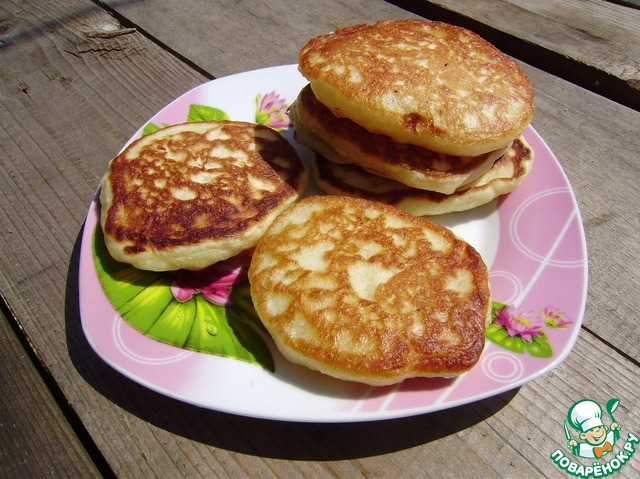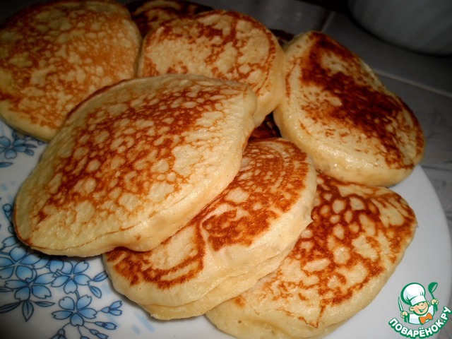 Готовые оладьи подаем к чаю со сметаной, вареньем или сгущеным молоком. Ну, или еще с чем-нибудь любимым.