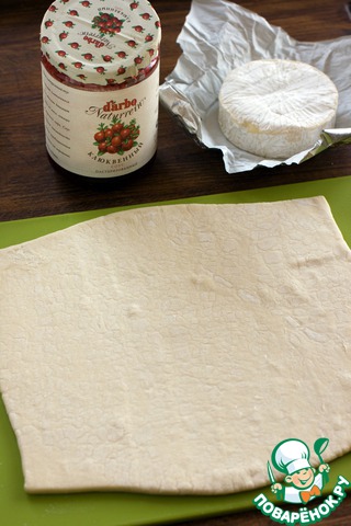 В центр раскатанной части слоеного теста положить клюквенный или брусничный соус. Соуса можно и побольше, чем у меня на фото.