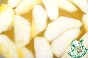 Поместить сок в кастрюльку, добавить процеженный лимонный сок и сахар (150 г), нагреть до кипения, дать немного повариться, и, на медленном огне, небольшими порциями, сварить в нем яблочные дольки до прозрачности.