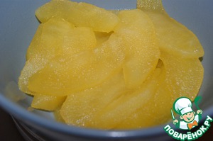 • Поместить сок в кастрюльку, добавить процеженный лимонный сок и сахар (150 г), нагреть до кипения, дать немного повариться, и, на медленном огне, небольшими порциями, сварить в нем яблочные дольки до прозрачности.