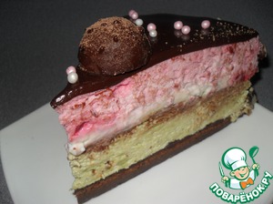 Глазурь: залить холодной водой 6 г листового желатина. Смешать 0,5 ст. сахара, 4 ст. л. какао,125 мл сливок и 1/4 ст. воды. Довести до кипения, поварить 1 минуту, снять с огня и добавить отжатый желатин. Остудить и вылить на торт.