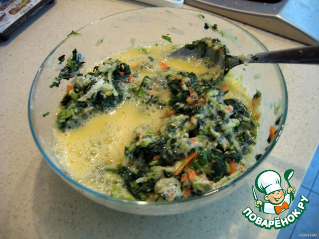 4. Всыпать в овощи муку, перемешать до получения густого теста. Добавить слегка взбитые яйца, все перемешать.