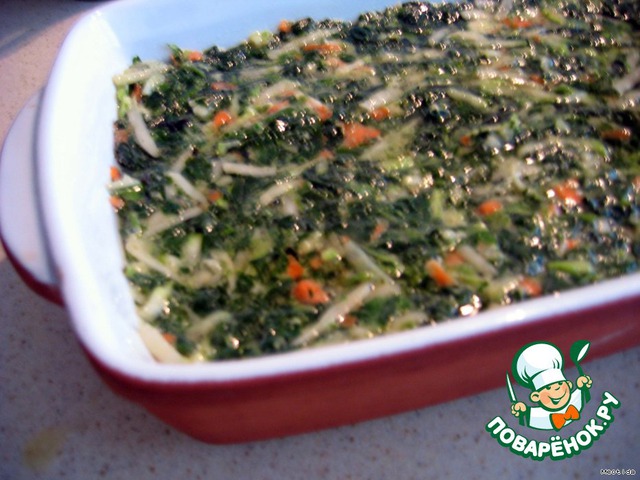 6. Разогреть духовку до 200°С. Налить в маленькую форму для запекания оливковое масло, подогреть в духовке 5 минут, полить им сверху овощную смесь. Поставить кугель в духовку. Готовить 20 минут, потом понизить температуру до 180°С и готовить еще минут 15-25, пока не образуется золотистая корочка.