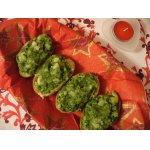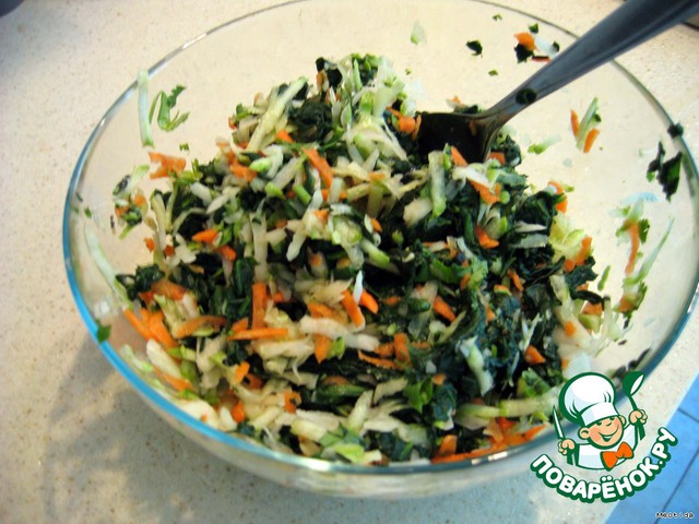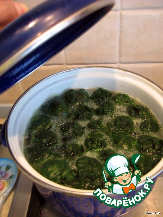 2. Шпинат отварить до мягкости, слить воду, обсушить и нарезать полосками.