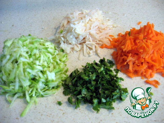 1. Овощи и зелень вымыть. Картофель, морковь, кабачок почистить и натереть на крупной терке. Слегка отжать. зелень и чеснок мелко нарезать, смешать с овощами