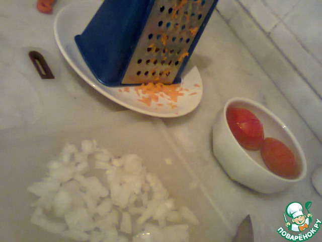 Морковь натереть на крупной терке, лук мелко нарезать, помидоры надрезать и залить кипятком.