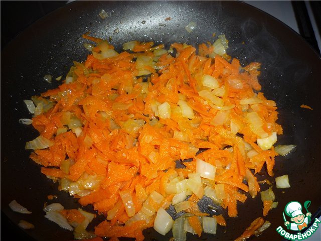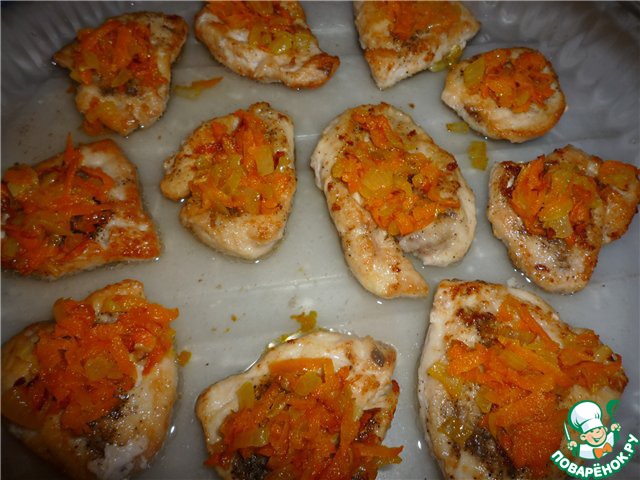 В форму или на противень наливаем немного воды, чтобы покрывало всю поверхность, выложить в форму обжаренную курочку. Первым слоем выложить пассерованые лук и морковь.