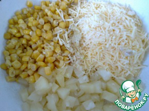 Сыр натереть, чеснок раздавить, ананасы порезать (если шайбы).