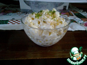 Все перемешать, добавить майонез. Попробовать, при необходимости добавить еще чеснока. Приятного аппетита