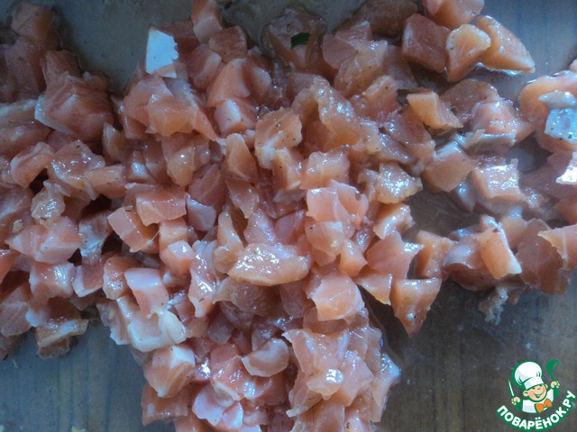 • Нарезаем малосоленую красную рыбу кубиками или соломкой (кому как нравится).