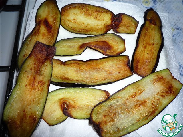 Аккуратно промыть полоски баклажанов от соли, обсушить, пожарить с 2-х сторон на растительном масле до золотистого цвета.