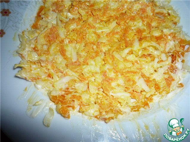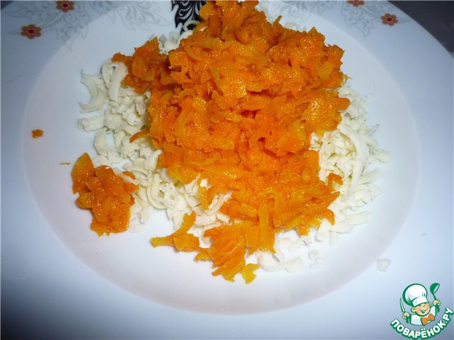 Два типа сыра положить в морозилку на 15-20 мин., затем натереть на мелкой терке, добавить морковь.