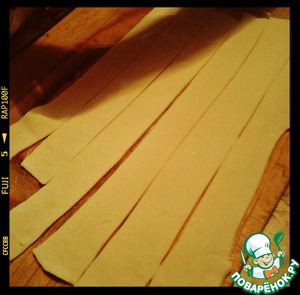 Слоеное тесто слегка раскатайте и порежьте вдоль.