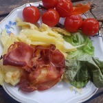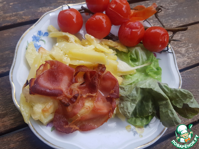 Разогрейте духовку до 170 °С. В форму, смазанную маслом, послойно уложите очищенные и тонко нарезанные ломтики картофеля, лук и бекон, приправив солью и перцем. Перемешайте сливки с мускатом.