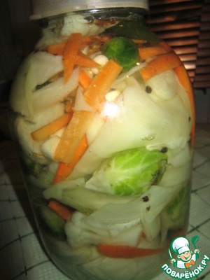 Приготовим маринад: вскипятим воду, растворим соль и сахар (получается достаточно сладкая капуста, так что регулируйте под свой вкус). Заливаем капусту горячим маринадом и закрываем крышкой. Когда остынет, ставим в холодильник. Через сутки закуска будет готова. Храните ее в холодильнике, но недолго.