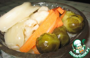 Каждый сорт капусты по очереди опускаем в кипящую воду на 2 минуты и сразу же обдаем холодной водой. Удобно это делать, положив капусту в дуршлаг.