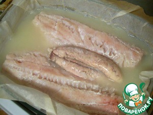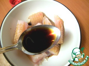 Срежем с хребта щуки филе, зальем его соевым соусом "Киккоман", дадим постоять минут 15.