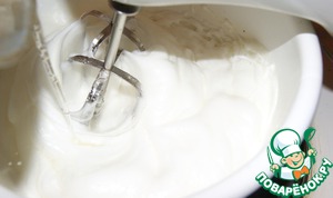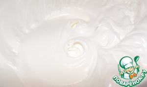 Параллельно я взбила до устойчивых пиков белки и, не переставая взбивать, тонкой струйкой влила горячую карамель, взбивая всё до пышной массы и пока она не остынет. (на фото слева видна струйка карамели).