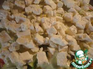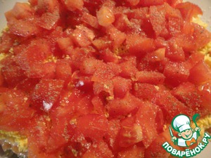 Далее - порезаный кубиками помидор. Помидор лучше брать мясистый. С небольшим количеством сока. Помидор подсаливаем и перчим.