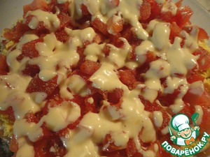 Сбрызгиваем помидор майонезом. Без фанатизма, салат и так достаточно калорийным выходит.