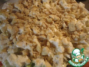 Далее слой тертых на мелкой терке белков и немного майонеза.
