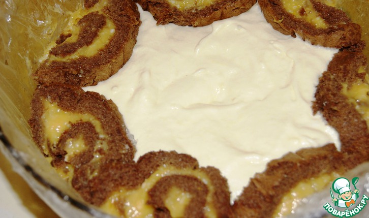 Заполнить муссом и накрыть сверху оставшимися кусочками рулета, поместить на ночь в холодильник.