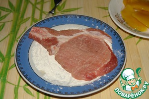 • Теперь займемся мясом. Запанировать мясо в муке с двух сторон.