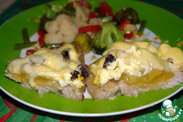• На мясо, в центр, кладем ломтик манго, или кружочек персика, или половину кружочка ананаса.