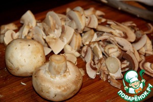Шампиньоны и лук нарезать кусочками и обжарить на оливковом масле до золотистого цвета. Разделить грибы на 2 равные части - она пойдет в соус, другая в фарш.