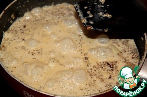Пока наше мясо запекается, сделаем соус. Измельчим готовые грибы, которые мы отложили в блендере, добавим сливки 100мл и сыр. Прогреем соус на сковородке и еще раз взобьем.