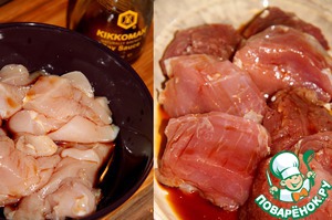Этот рецепт вычитала в журнале "Планета вкуса". Получаются котлетки среднего размера, внутри с нежным кусочком вырезки. Для приготовления этого рецепта нам понадобится вырезка - нарезать на небольшие кусочки, толщиной не больше 2х см, и куриное филе, которое нужно порубить на небольшие кусочки. В разной посуде замариновать мясо и птицу в соевом соусе.