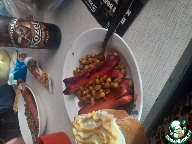 Для закуски надо: сосиски в натуральной оболочке, горошек консервированный, горчица и масло растительное для жарки.