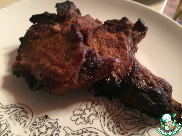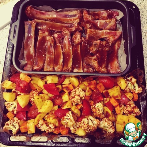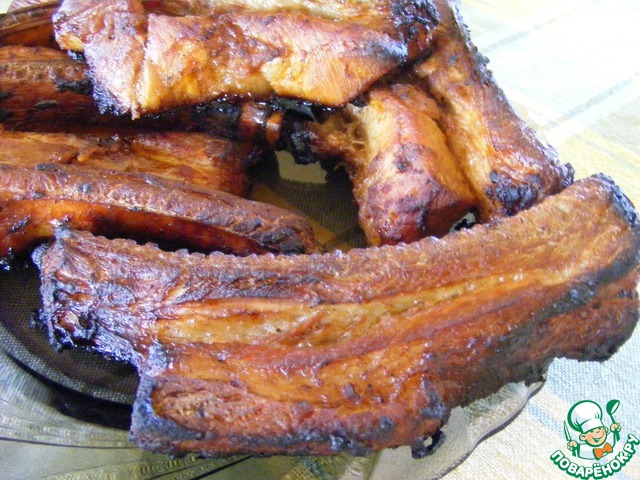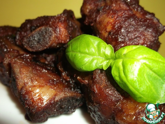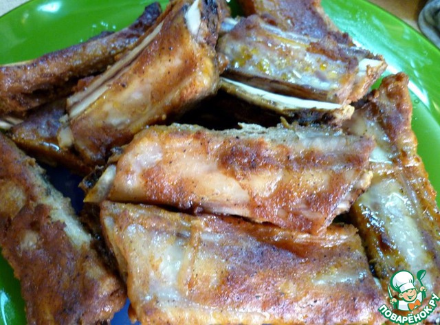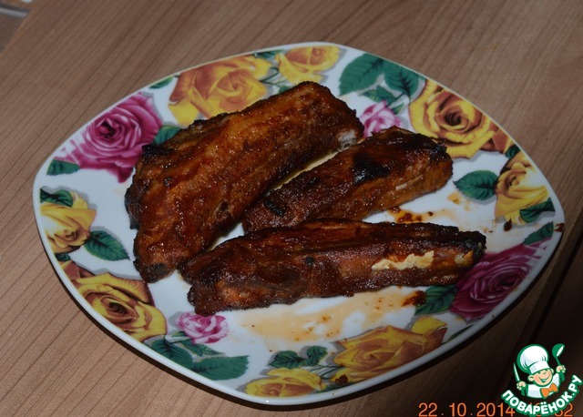 Выложите ребра на противень, накройте фольгой и запекайте от одного часа до полутора при Т220 С. если мясо выделит слишком много сока, слейте его.
