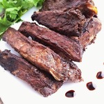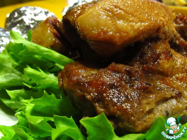 Оставшимся соусом смазывайте ребра каждые 20-30 минут. Через 40 минут фольгу снять и запечь мясо до румяности.