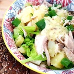 5. Картофель сварить в мундире, слегка остудить, нарезать ломтиками и сразу же смешать с заправкой.