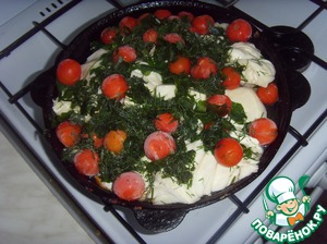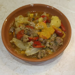 Наливаем в казан растительное масло и немного обжариваем мясо. Затем укладываем послойно - лук полукольцами, картофель (средний) разрезаем на четвертинки, можно половинки, морковь крупными кольцами, болгарский перец на 4 части, капуста, тоже крупно. Сверху кружками положить помидоры (у меня здесь маленькие, замороженные, потому что делала сейчас, зимой). И порезанная зелень...