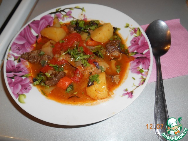 Это среднеазиатское национальное блюдо. Томленое мясо с овощами. Очень ароматно, сытно, полезно... Выглядит и пахнет необыкновенно! Это блюдо, помимо всего, считается и диетическим именно из-за того что ничего не жарится.