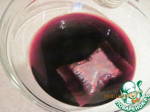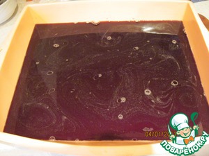 Около 50-70 мл напитка откладываем (оставляем), в остальной теплый глинтвейн вводим распущенный желатин, хорошо перемешиваем, выливаем смесь в большую емкость, уровень смеси не должен превышать 1 см и ставим на холод для застывания