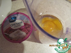 Яйца взбиваем с сахаром, добавляем сметану, какао-порошок, растопленный шоколад, муку, разрыхлитель или соду. Тесто получается жидковатым, но муки больше не добавляем.
