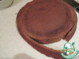 Готовый бисквит остужаем и выравниваем. У меня нет двух форм разного диаметра, поэтому я обрезала бисквит по кругу на 1 см. Обрезки нам не понадобятся, их можно использовать для подачи этого десерта в бокалах (покрошить и залить кремом) или отдать на съедение детям. Моя дочка была рада, сказала "О, мама шоколадного Барни испекла!"