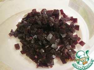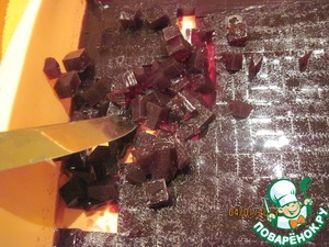 Застывшее желе прямо в форме режем на квадратики, по размеру, как на винегрет.